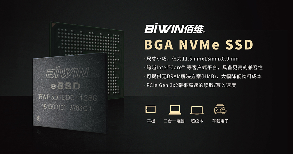 放眼未來5G加持下的物聯網時代,隨著智能終端小型化趨勢持續演進,小尺寸的存儲產品愈加受到青睞。佰維PCIe BGA SSD的尺寸小至11.5mm X 13mm, 擁有32Gb/s高速傳輸速率,最大規格容量達512GB,能很好地應用于輕薄商務本、二合一電腦、平板等移動終端;M.2 2230 PCIe SSD作為M.2 PCIe SSD中最小尺寸22mmx30mm規格產品,搭載PCIe Gen3x4接口,讀速高達2100MB/s,可充分滿足5G高速網絡下超薄型筆記本、平板等移動終端的存儲需求。