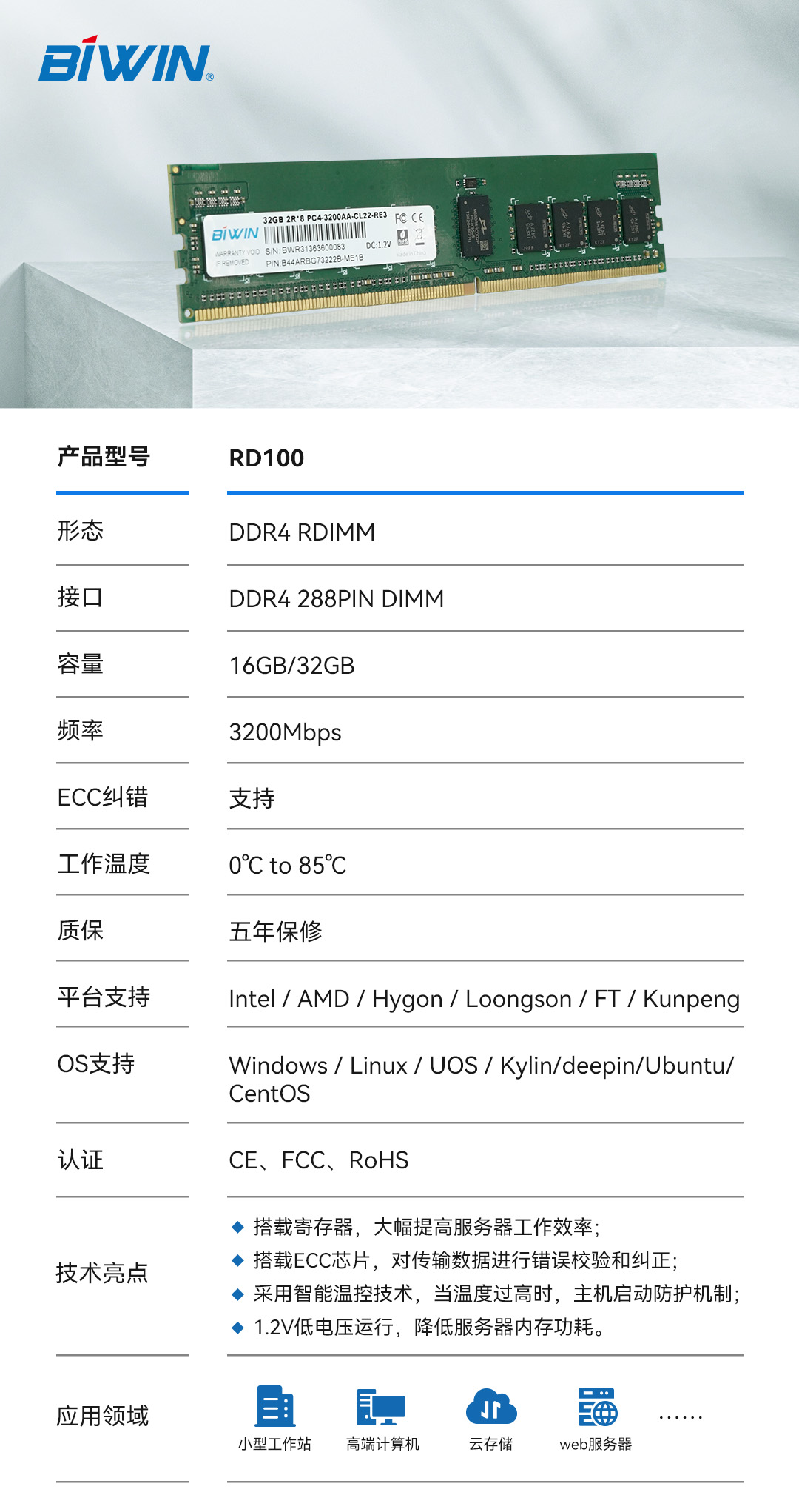 近日,佰維存儲RD100系列DDR4 RDIMM服務(wù)器專用內(nèi)存模組32GB、16GB版本通過Intel授權(quán)實驗室AVL認證,驗證該系列產(chǎn)品適配并兼容Intel CPU及主板。佰維RD100系列嚴格按照JEDEC標準進行設(shè)計生產(chǎn),并通過全方位質(zhì)量管控,實現(xiàn)產(chǎn)品的高質(zhì)量與高可靠性,兼容主流CPU、主板與操作系統(tǒng),廣泛適用于小型工作站、高端計算機、云存儲、web服務(wù)器、直播服務(wù)器等領(lǐng)域。