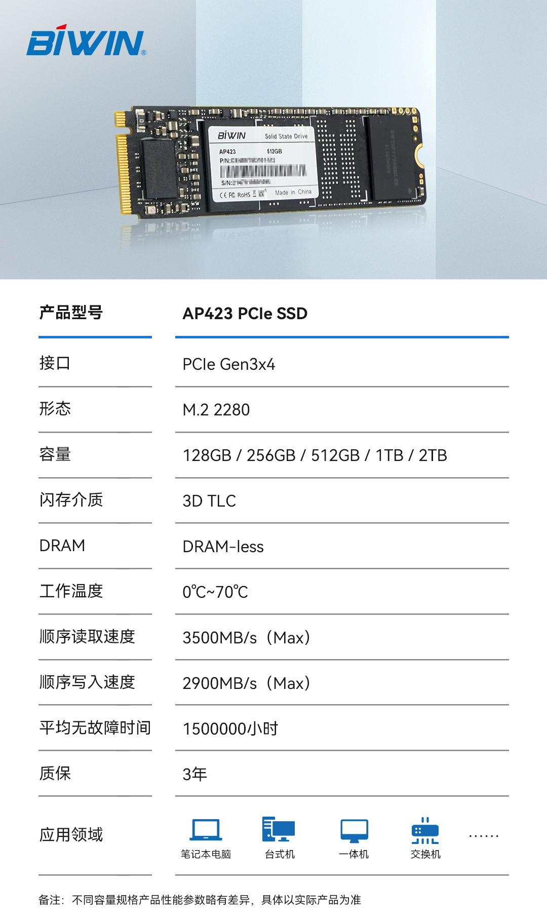 佰維AP423系列PCIe SSD采用標準的M.2 2280規(guī)格,接口支持PCIe 3.0x4,NVMe 1.4協(xié)議,最大容量2TB,持續(xù)讀寫速度最高分別為3.5GB/s、2.9GB/s,同時采用低功耗的DRAM-less設計,擁有HMB、數(shù)據(jù)巡檢、電源管理等眾多功能。