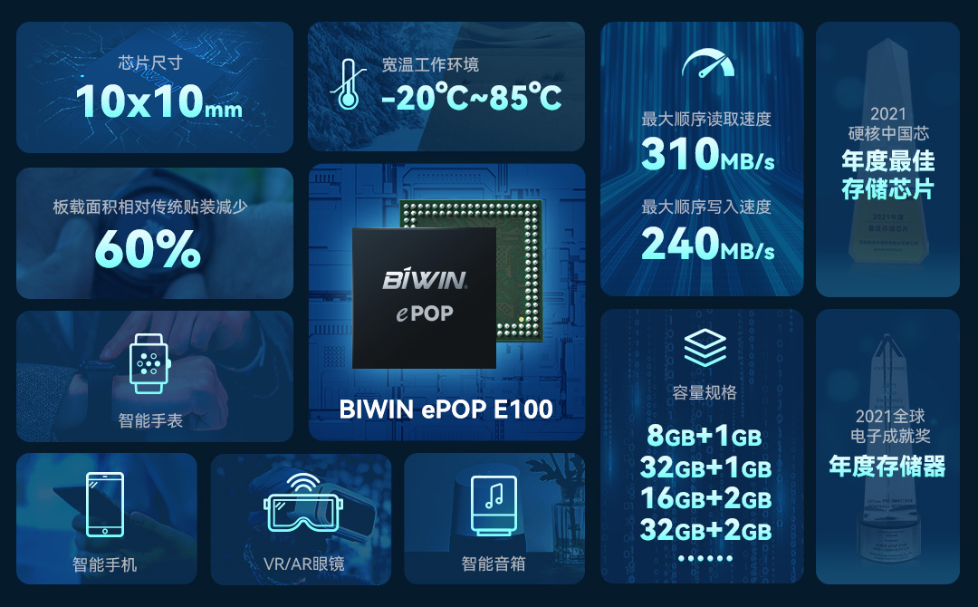 佰維E100系列ePOP芯片良好的性能和品質,贏得智能穿戴設備產業鏈合作伙伴的廣泛認可。該系列產品通過高通等處理器平臺認證,并榮獲全球電子成就獎“年度存儲器"以及硬核中國芯“最佳存儲芯片”榮譽。在市場方面,公司E100系列目前已向Google、Face book等全球重要的智能穿戴設備大廠批量供貨,應用于其智能手表、VR眼鏡等智能穿戴設備上。為滿足客戶需求,公司將推出目前行業內尺寸最小的ePOP新產品,尺寸僅為8x9.5x0.79(mm)