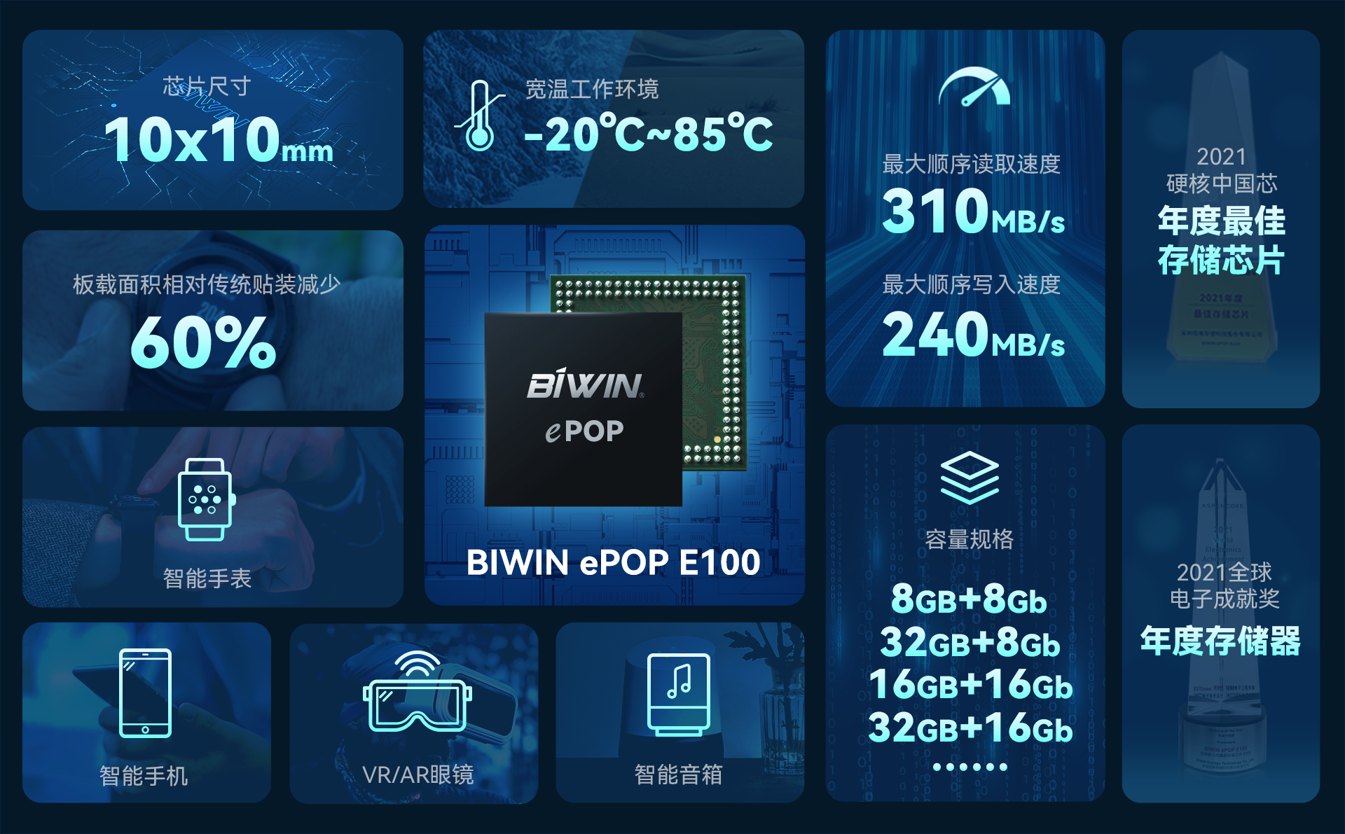值得一提的是,佰維ePOP芯片E100系列屢獲業界嘉獎,斬獲“2021 年全球電子成就獎年度存儲器”、“2021 年度硬核中國芯最佳存儲芯片”諸多殊榮。佰維eMCP與eMMC、UFS、BGA SSD、LPDDR、MCP、SPI NAND等存儲芯片,通過通用型和定制化產品的輸出,共同構建了公司豐富的嵌入式存儲芯片解決方案,持續為智能終端客戶提供有競爭力的存儲產品。