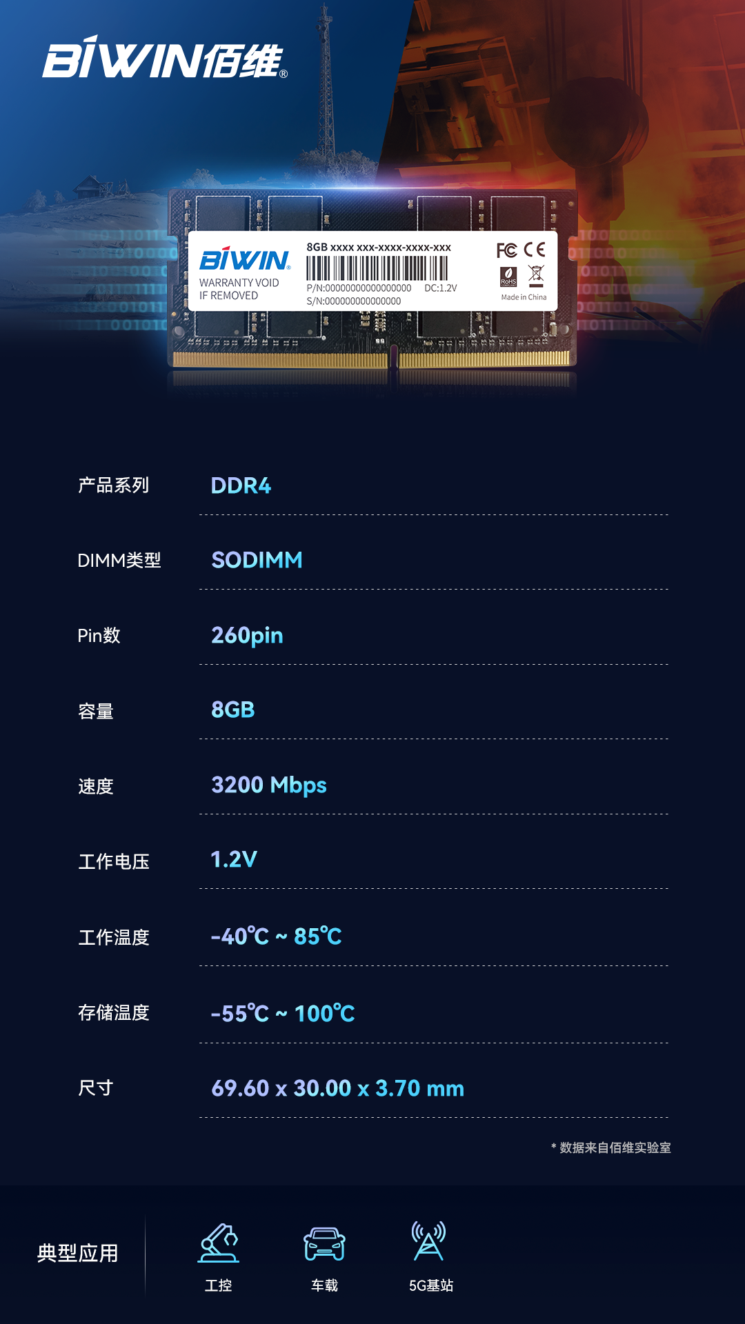 聚焦5G基站、邊緣計算、AI設(shè)備、車載應(yīng)用、工控安防等領(lǐng)域,越來越多的工業(yè)類應(yīng)用及設(shè)備對存儲解決方案提出了更高要求:長時間持續(xù)高速運算及嚴苛的運作環(huán)境下,存儲產(chǎn)品必須擁有高穩(wěn)定性、高可靠性,也必須經(jīng)過適應(yīng)極端溫度變化、防塵、抗震動、抗沖擊、抗硫化等種種考驗,從而保持高耐久度和長使用壽命。近期,佰維推出工業(yè)級寬溫SODIMM內(nèi)存條,賦能嚴苛環(huán)境挑戰(zhàn)下的各種工業(yè)應(yīng)用。