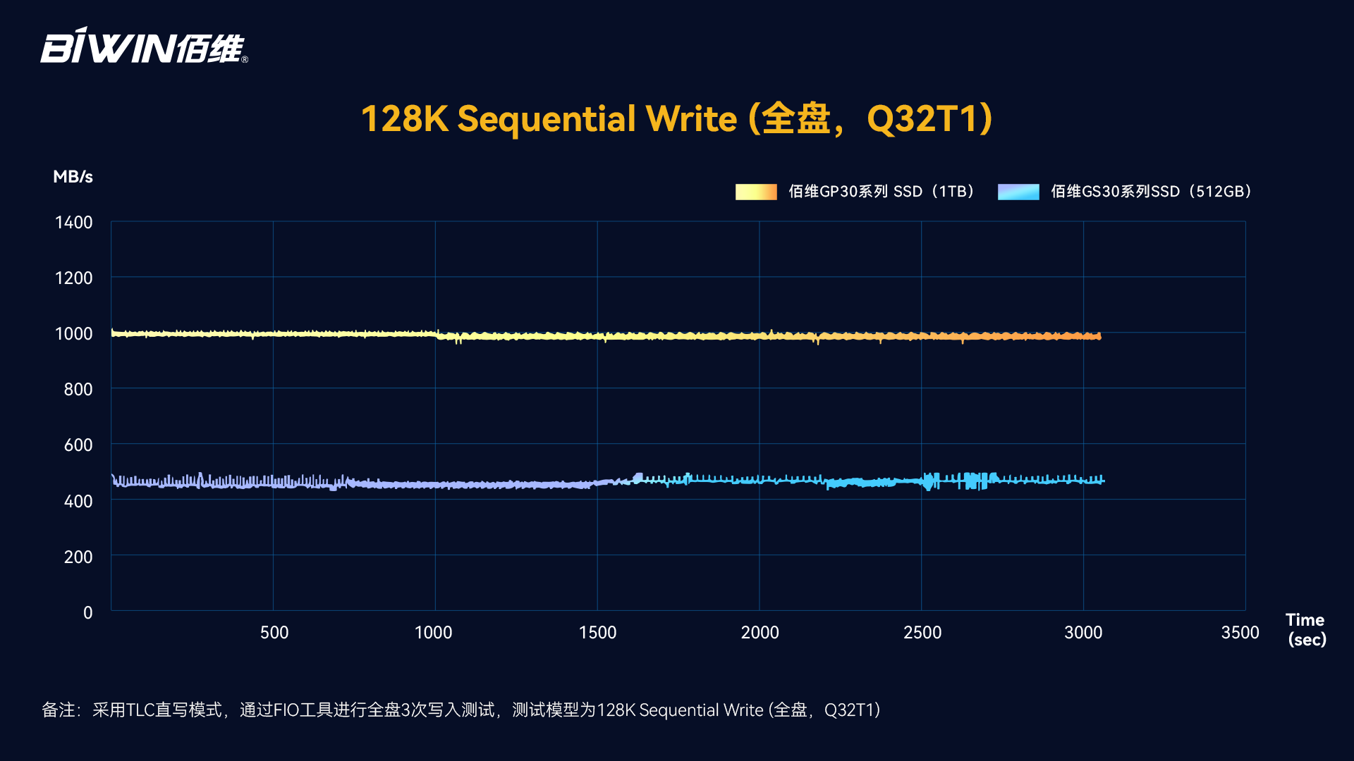 通過搭配全自研固件,系列產品具備優異的性能,其中GP30系列SSD采用PCIe Gen3.0x4接口、NVMe1.4協議,最高順序讀寫速度分別達到3400MB/s、2700MB/s,容量最高可達2TB。此外,基于固件的多重優化,GP30/GS30系列SSD的數據持續讀取、寫入性能穩定,在FIO測試中,GP30系列SSD全盤寫入速度約保持在1000MB/s,GS30系列SSD全盤寫入速度約保持在450MB/s。