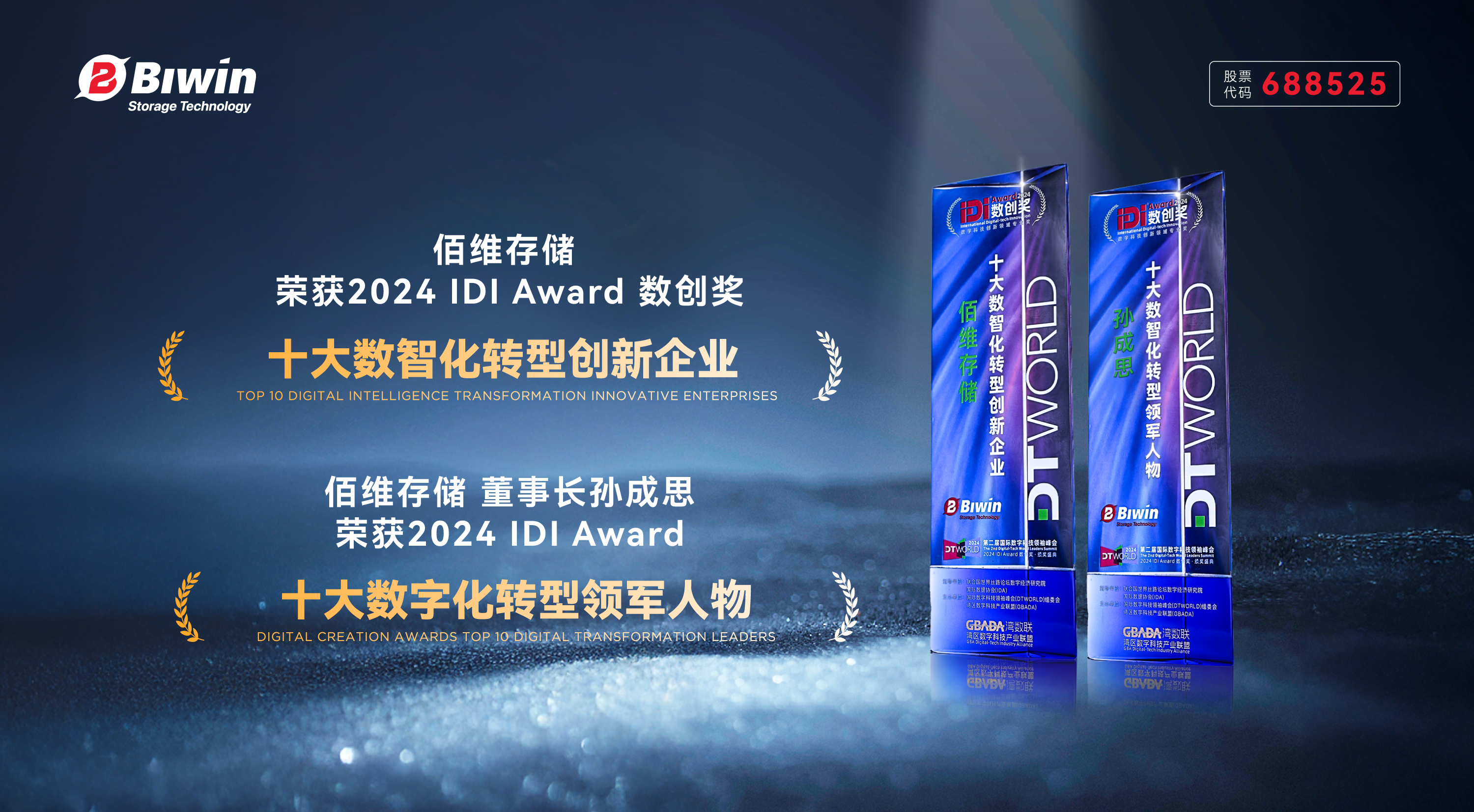 近日,2024 DT WORLD國際數字科技領袖峰會暨IDI Award 數創獎·頒獎盛典在深圳成功舉辦,佰維存儲榮獲“十大數智化轉型創新企業”,公司董事長孫成思榮獲“十大數字化轉型領軍人物”,此次獲獎不僅是對佰維存儲技術實力和創新能力的認可,也標志著公司在推動自身及產業數智化轉型方面取得了顯著成就。