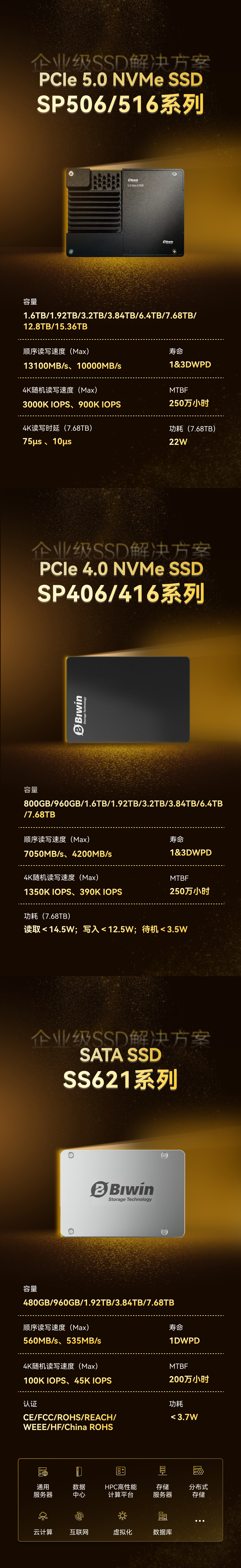 依托長期積累形成的綜合技術(shù)實力和先進封測制造能力,佰維構(gòu)建了豐富齊備的企業(yè)級SSD+RDIMM產(chǎn)品線,涵蓋高性能企業(yè)級PCIe 4.0/5.0 NVMe SSD、SATA SSD、DDR5/DDR4 RDIMM以及CXL 2.0內(nèi)存擴展模塊。系列產(chǎn)品兼顧高吞吐量、高IOPS、低延遲、優(yōu)異的QoS特性、高密度以及成本效益,兼容Intel、AMD以及鯤鵬、海光、龍芯、飛騰、兆芯、申威等服務(wù)器系統(tǒng),能夠適應(yīng)各種企業(yè)級讀寫密集型和混合應(yīng)用場景,滿足云計算和大規(guī)模數(shù)據(jù)中心數(shù)據(jù)高速傳輸、快速響應(yīng)、高效分析等需求,覆蓋各行業(yè)業(yè)務(wù)場景AI應(yīng)用,產(chǎn)品性能和品質(zhì)獲得行業(yè)類客戶及市場的廣泛認(rèn)可。其中,佰維企業(yè)級PCle 5.0 SSD——SP506/516系列產(chǎn)品榮獲了DOIT AWARD 2024存儲風(fēng)云榜“2024年度企業(yè)級固態(tài)盤產(chǎn)品金獎”。