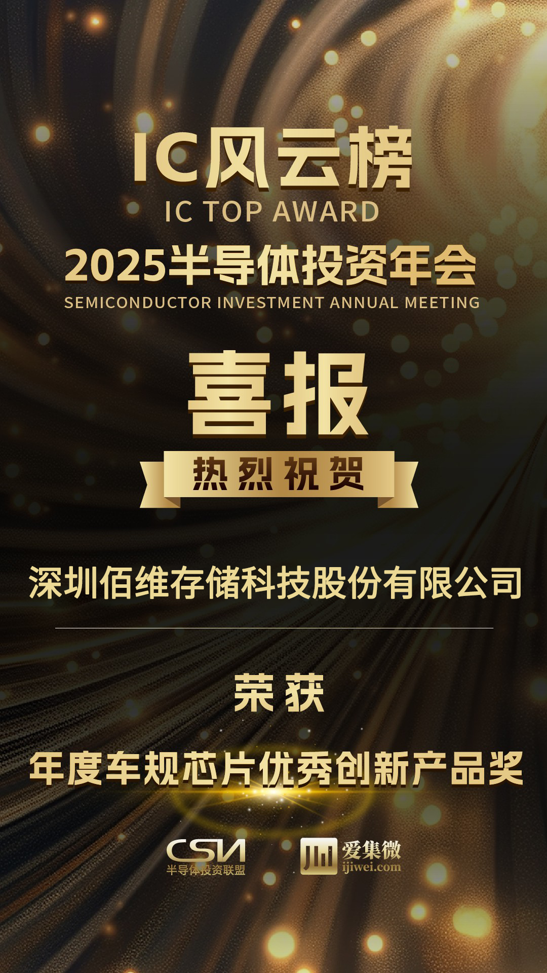 近日,由半導體投資聯盟主辦、愛集微承辦的“2025半導體投資年會暨IC風云榜頒獎典禮”在上海·上海中心圓滿舉行。佰維存儲TAE308/318系列車規級 eMMC 榮獲IC風云榜年度車規芯片優秀創新產品獎,彰顯公司在汽車電子領域的技術實力與產品創新能力。