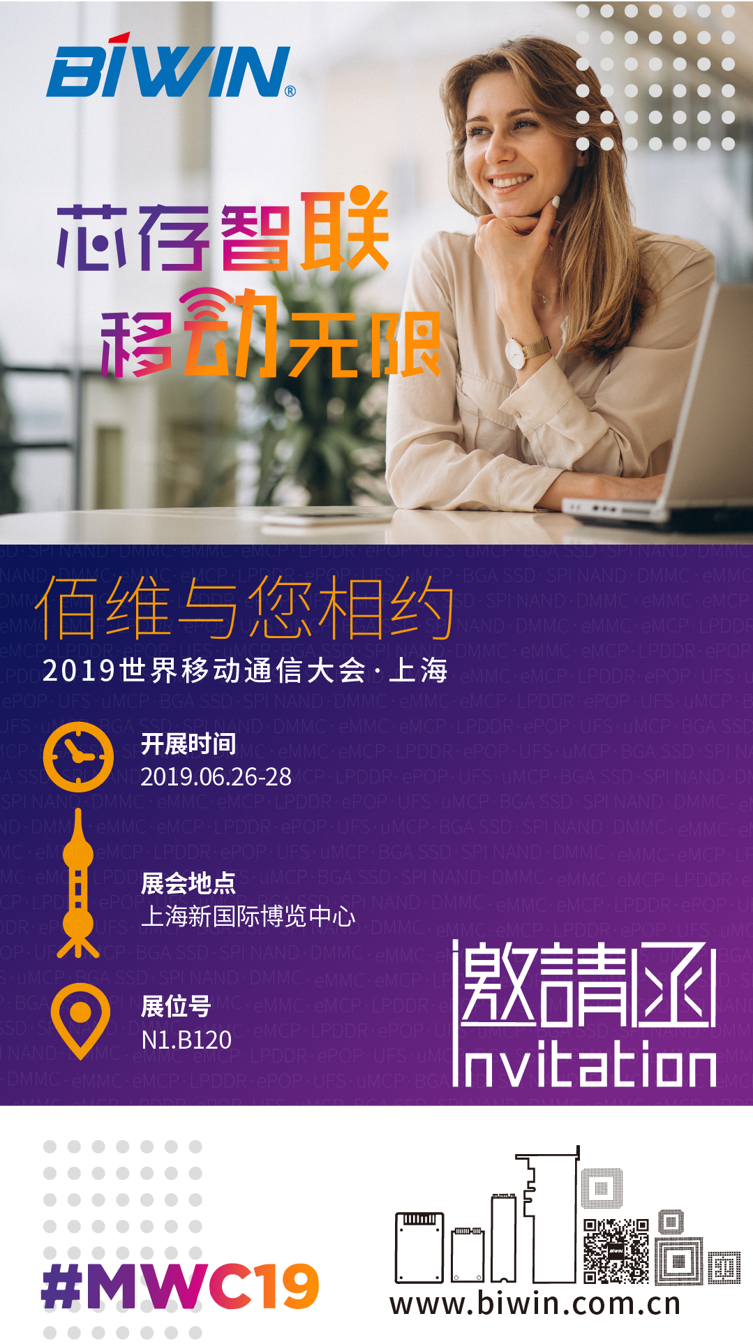 6月26日至28日,亞洲科技行業(yè)盛會(huì),MWC 2019 (世界移動(dòng)大會(huì))將在上海新國(guó)際博覽中心舉行。佰維以“芯存智聯(lián)、移動(dòng)無(wú)限”為主題,將攜全系列嵌入式芯片解決方案亮相展會(huì),為移動(dòng)互聯(lián)時(shí)代,智能應(yīng)用產(chǎn)品小型化、微型化、集成化發(fā)展提供數(shù)據(jù)存儲(chǔ)支持。
